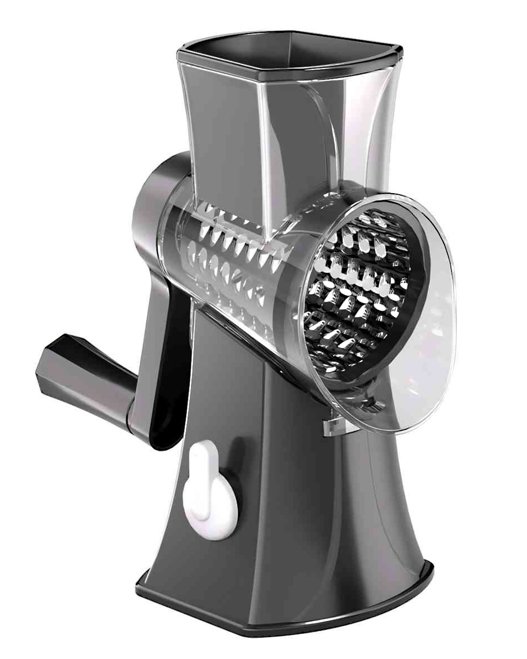 - Subtle Design : The powerful suction base keeps the cheese grater firm on a clean or smooth counter-tops like marble, glass. Plus, the transparent barrel with an inclined curvature reduce jamming in the cheese shredder